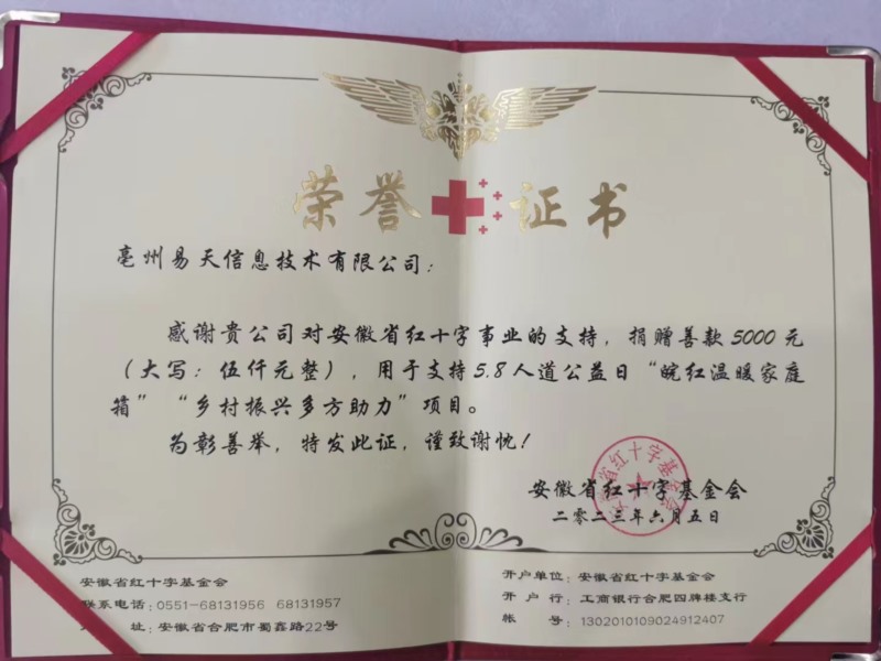 亳州易天科技捐款安徽省紅十字會